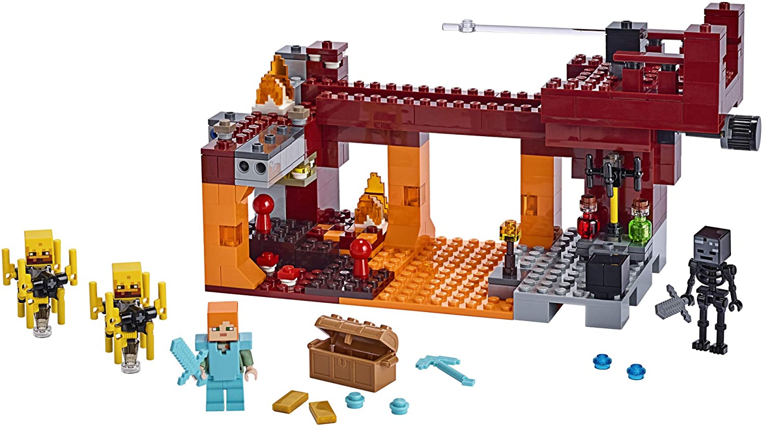Bộ mô hình LEGO Minecraft  bao gồm một nhân vật nhỏ Alex, cùng với một nhân vật bộ xương khô héo với một thanh kiếm Minecraft và 2 nhân vật lửa với các thanh lửa có thể quay được